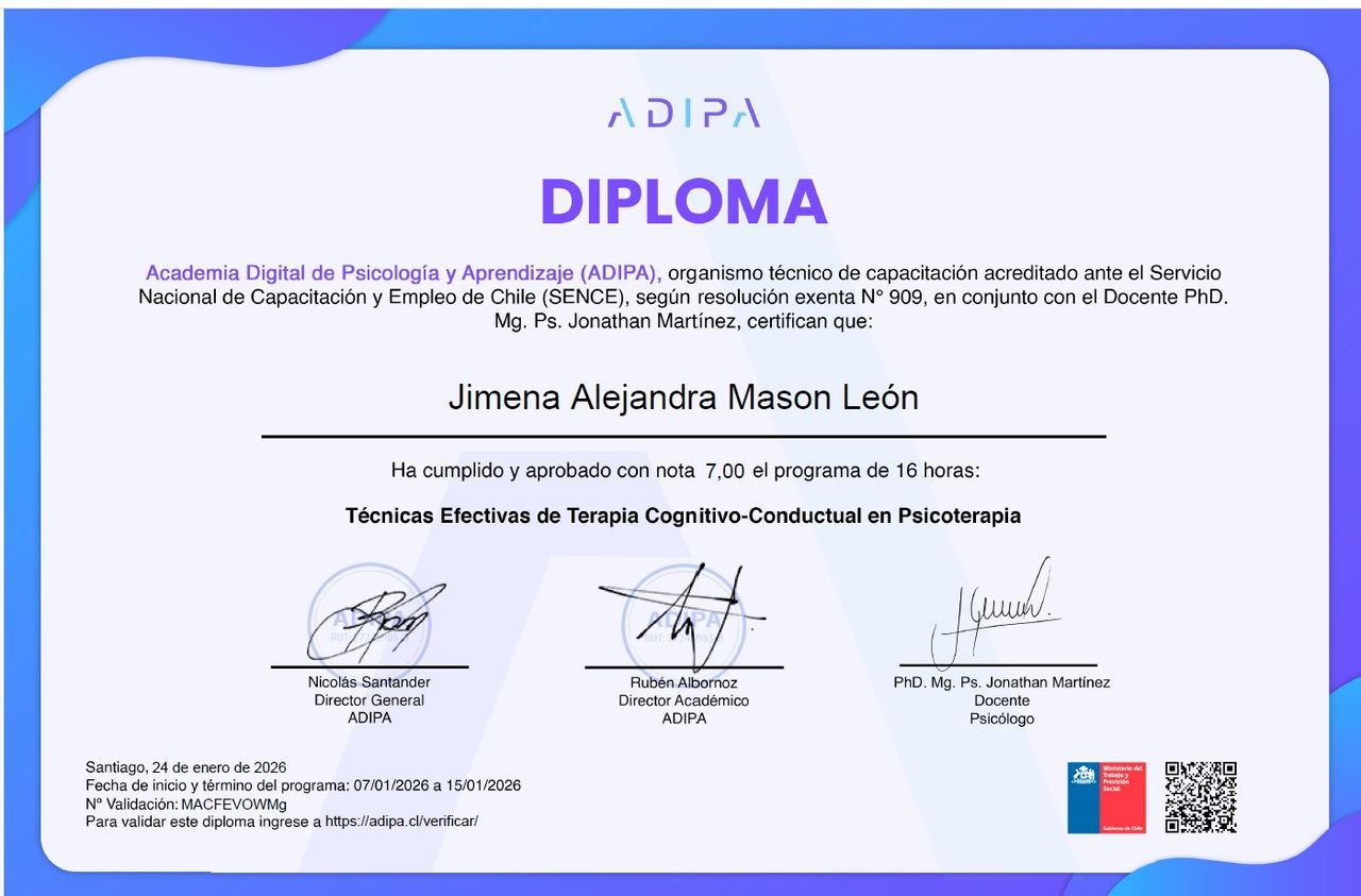 Soy psicóloga con Magíster en Psicología Clínica y más de 20 años de experiencia en el acompañamiento terapéutico de adolescentes y adultos. Mi trabajo se centra en ofrecer un espacio seguro, cercano y profesional, orientado a promover el bienestar emocional, el autoconocimiento y el desarrollo de herramientas prácticas para enfrentar las dificultades de la vida.